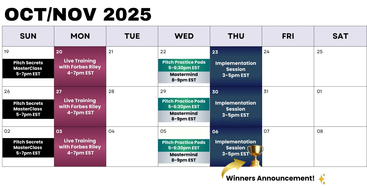 Get instant access to the full Pitch Like a Pro course and start mastering the formula at your own pace. You don’t have to attend live sessions to get results—everything you need is right here, on demand.